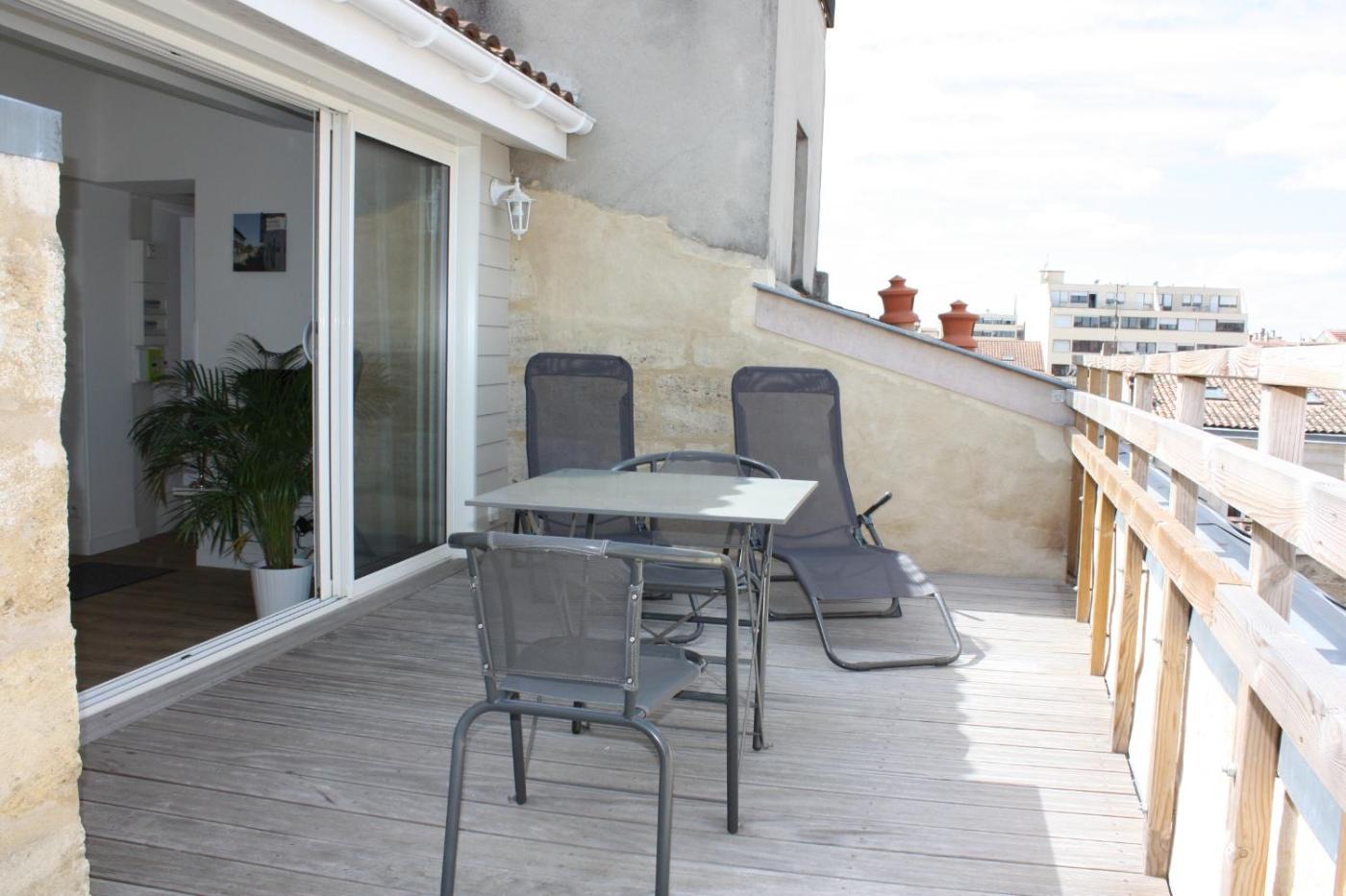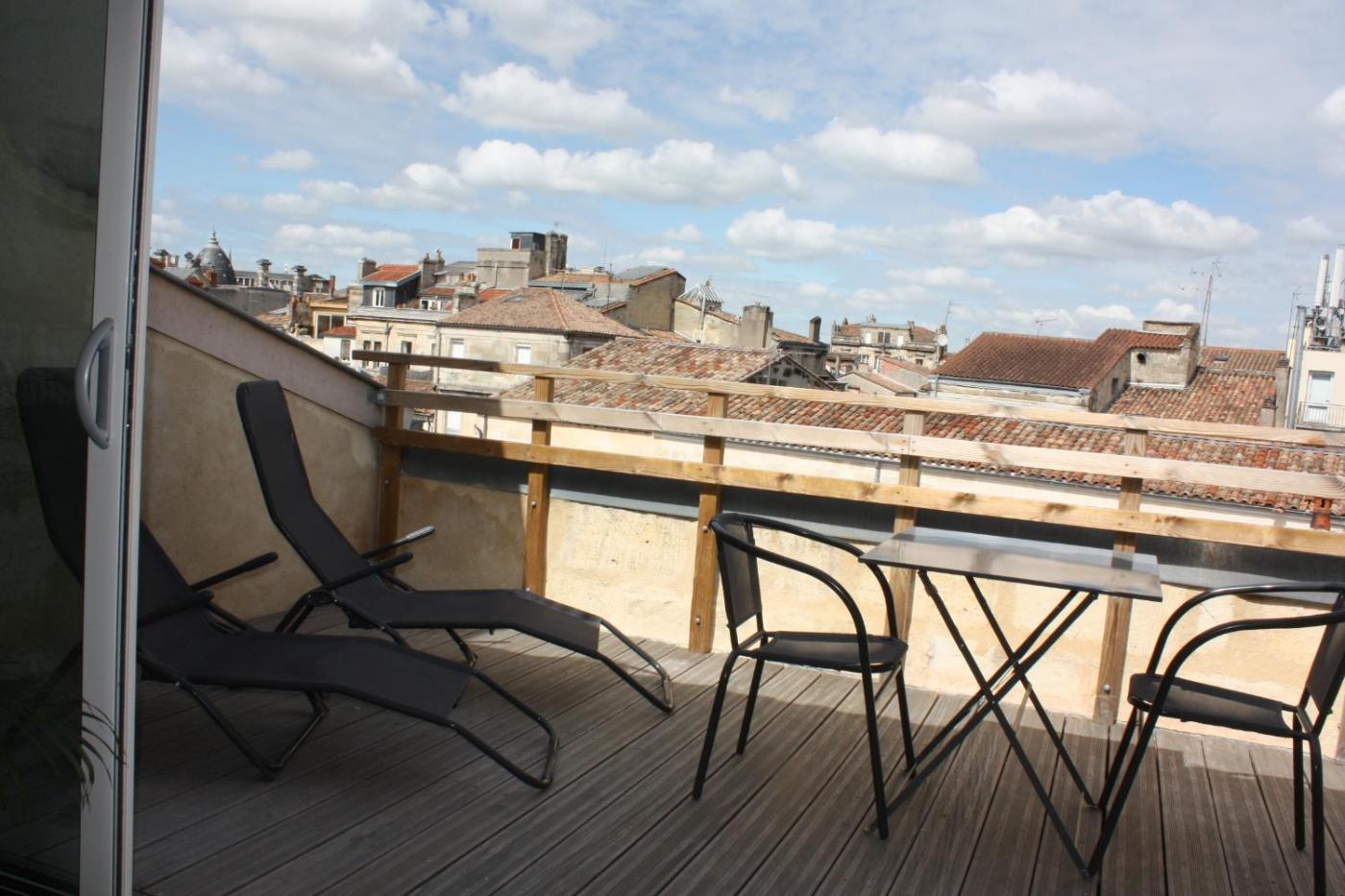 Studio avec Terrasse. Cet appartement mansardé est situé au 3e étage sans ascenseur. Vous profiterez d’une vue sur le clocher de l’église Saint-Michel et sur les toits de Bordeaux. Le logement comprend 1 grand lit et 1 lit simple.