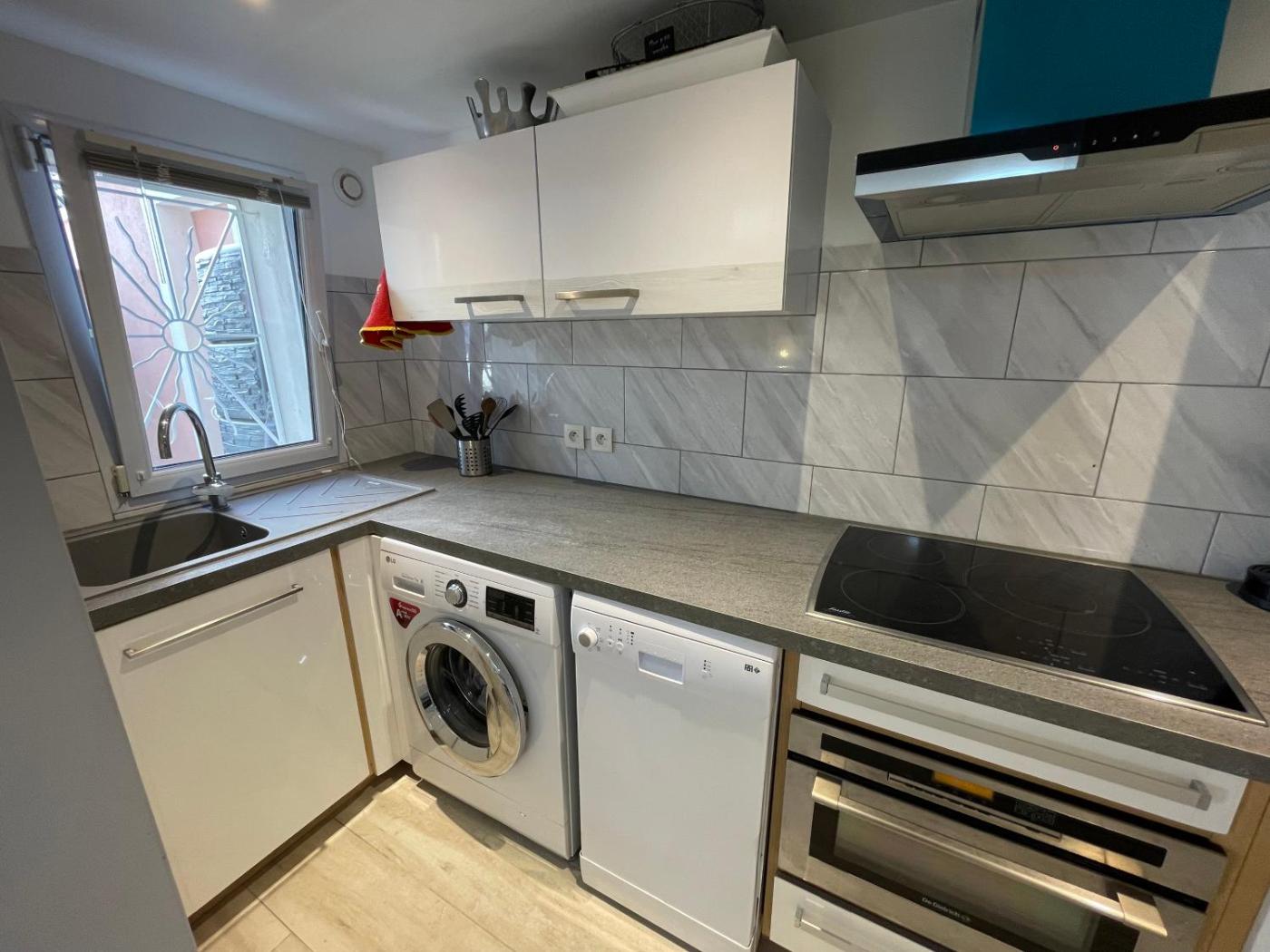Appartement 2 Chambres. Featuring a private entrance, this air-conditioned apartment is comprised of 1 living room, 2 separate bedrooms and 1 bathroom with a shower and a hairdryer. The well-equipped kitchen features a stovetop, a refrigerator, a dishwasher and kitchenware. Boasting a terrace with garden views, this apartment also offers a washing machine and a flat-screen TV. The unit offers 4 beds.