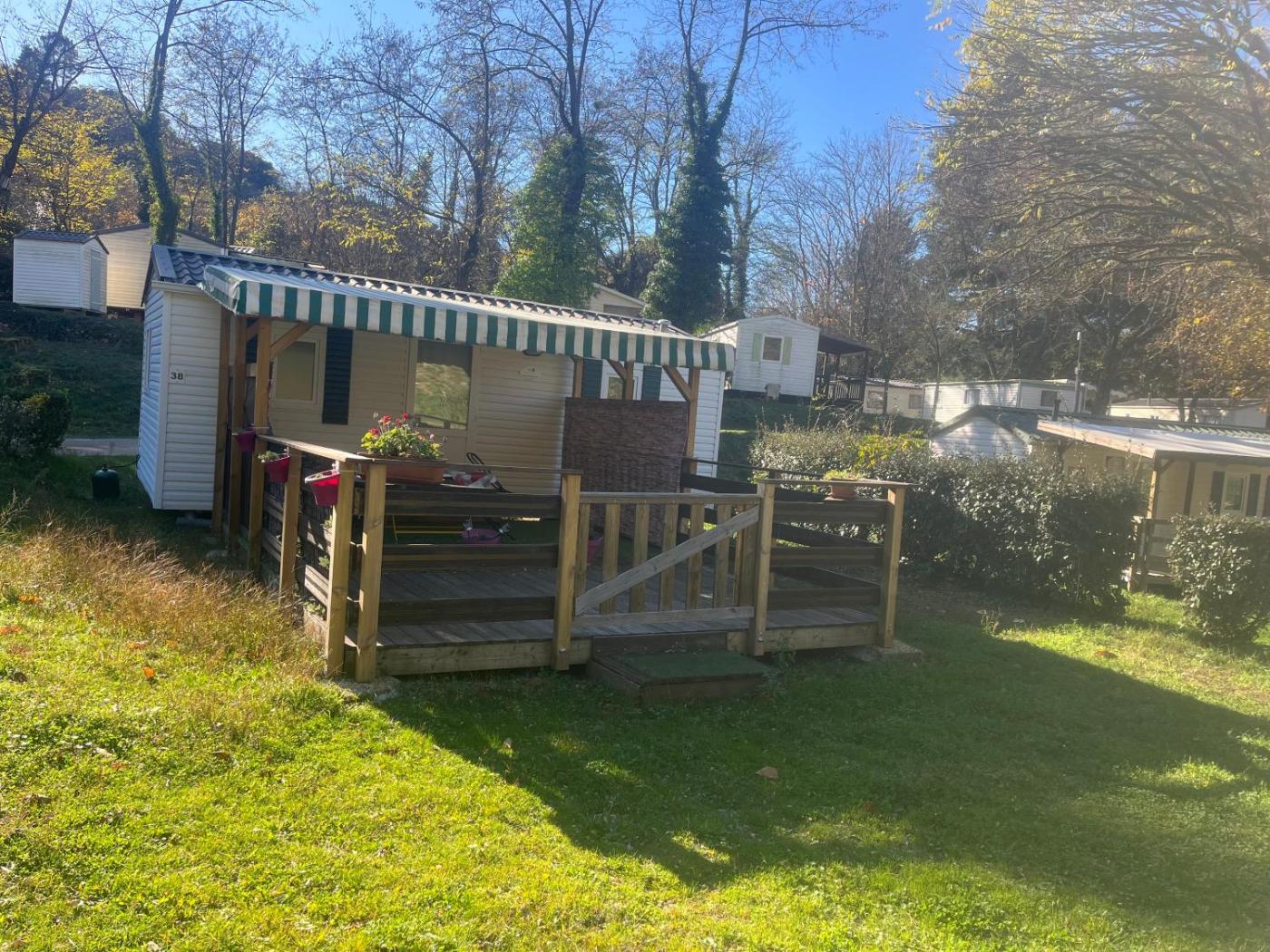 Mobile Home (Bleu). Guests will have a special experience as the mobile home features a private pool. This mobile home consists of 1 living room, 2 separate bedrooms and 1 bathroom with a shower. Guests will find a stovetop, a refrigerator, kitchenware and a microwave in the well-equipped kitchen. The mobile home also offers a barbecue. Featuring a terrace with garden views, this mobile home also provides a washing machine and a TV with satellite channels. The unit offers 4 beds. ;