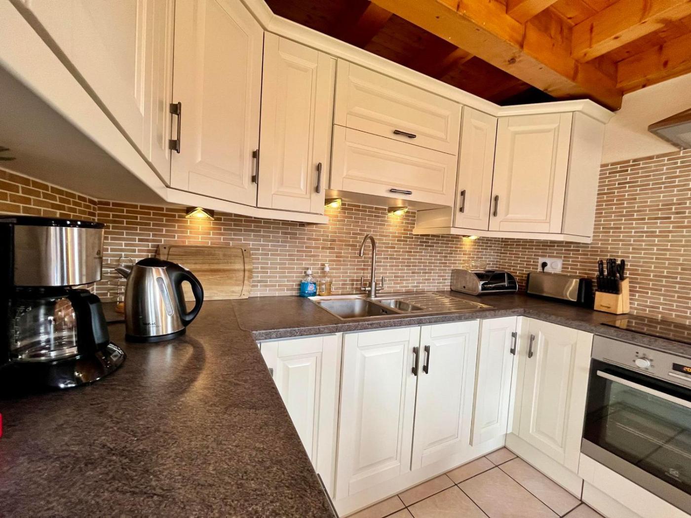 Ce chalet comporte 3 chambres séparées, 2 salles de bains, une cuisine entièrement équipée avec un coin repas et un réfrigérateur, ainsi qu’un salon avec une télévision.