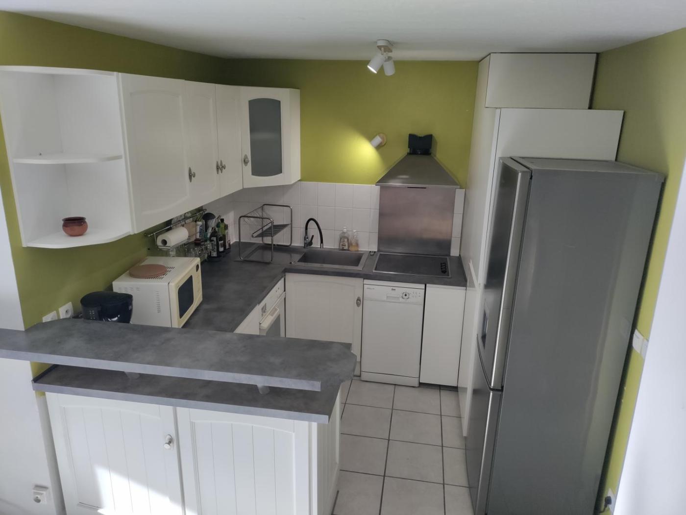 Appartement - Rez-de-Chaussée. The apartment features 2 bedrooms, 1 bathroom and a kitchen. Meals can be prepared in the kitchen, which comes with a stovetop, a refrigerator, a dishwasher and kitchenware. This apartment has a coffee machine, heating, a flat-screen TV and a balcony. The unit offers 6 beds.